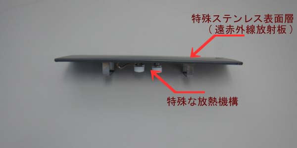 - 熱源である遠赤外線放射板に特殊ステンレス合金を使用し、印加電力が小さくても放射効率の高く幅広い業界の被物質に効果的に吸熱されます。従来のセラミック材に比べ大きな省エネ効果を実現します。