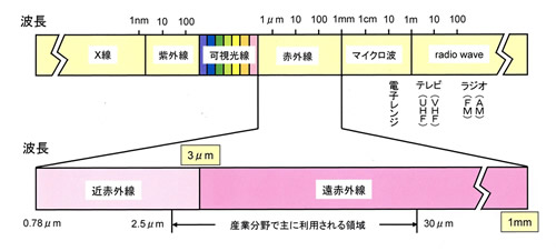 赤外線は、「X線」、「紫外線」、「可視光線」などと同じ「電磁波」であります。「波長」によって、その呼び名と性質が違うわけです。