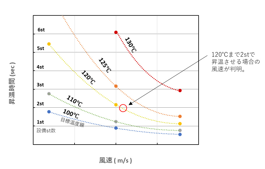 - 昇温条件:各処理温度ごとに風速と昇温時間を測定し、必要な熱風風速を導出。