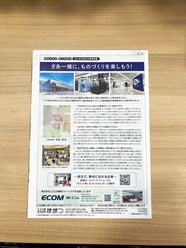 今回の掲載は、地域の皆様に当社の取り組みを知っていただける大変ありがたい機会となりました。浜松から関東、そして全国へと広がるエコムの挑戦は、持続的成長と企業価値の拡大につながるものと考えております。